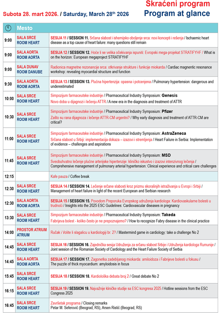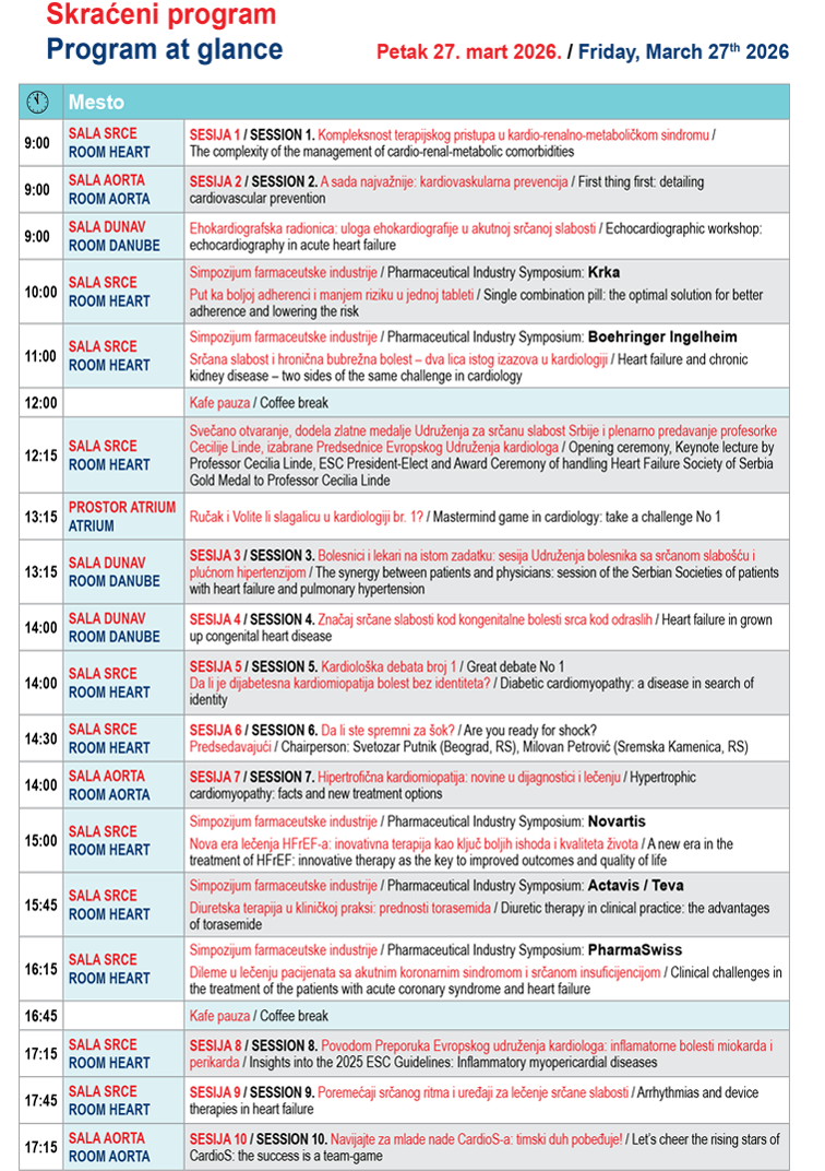Nagradna igra CardioS-a 2026 Slagalica: Pokušajte i ove godine da budete najbrži iPokušajte i ove godine da budete najbrži i najuspešniji (petak i subota, u vreme ručka). Preduslov za učešće u Slagalici je da se na početku prijavite skeniranjem QR koda (koji će biti na ekranu u u prostoru Atrium) pomoću svog mobilnog telefona. Odgovori na pitanja se šalju preko mobilnog telefona i anonimni su. Organizatori i rukovodioci: Aleksandra Đoković i Marina Ostojić.